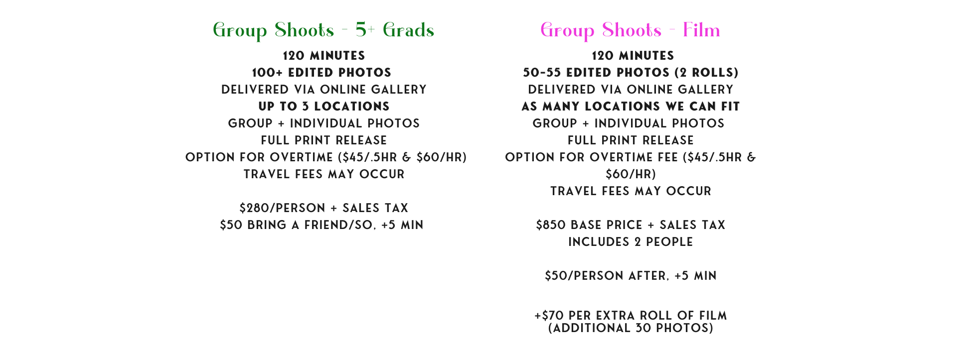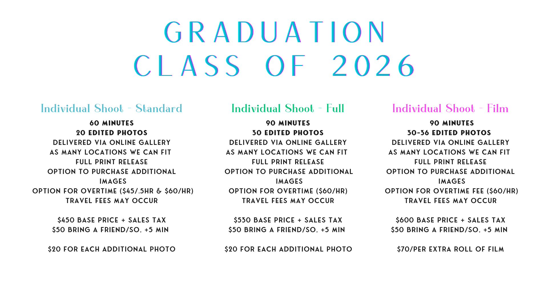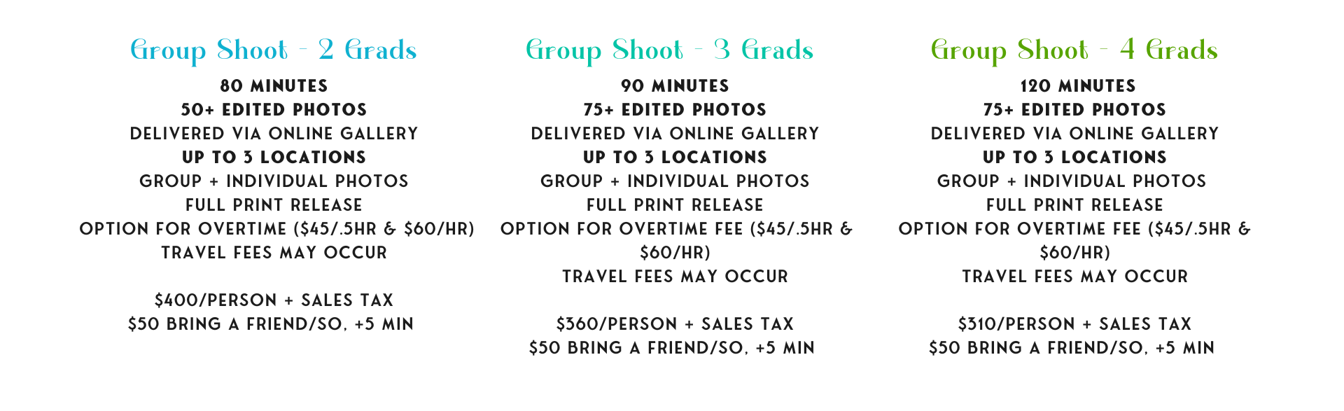 All kinds and sizes! Whether it be groups of friends, student clubs/orgs, they are all super fun. I can do couples, individual shoots and family shoots. Family shoots are perfect for including your parents and siblings who will be joining in on the graduation festivities!
